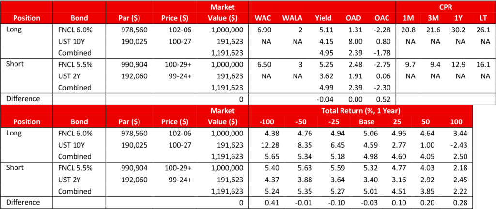 Portfolios are proceeds- and duration-neutral and invest the same market value in MBS and UST. Pools are FN MA5498 (6%) and FN MA5497 (5.5%).
