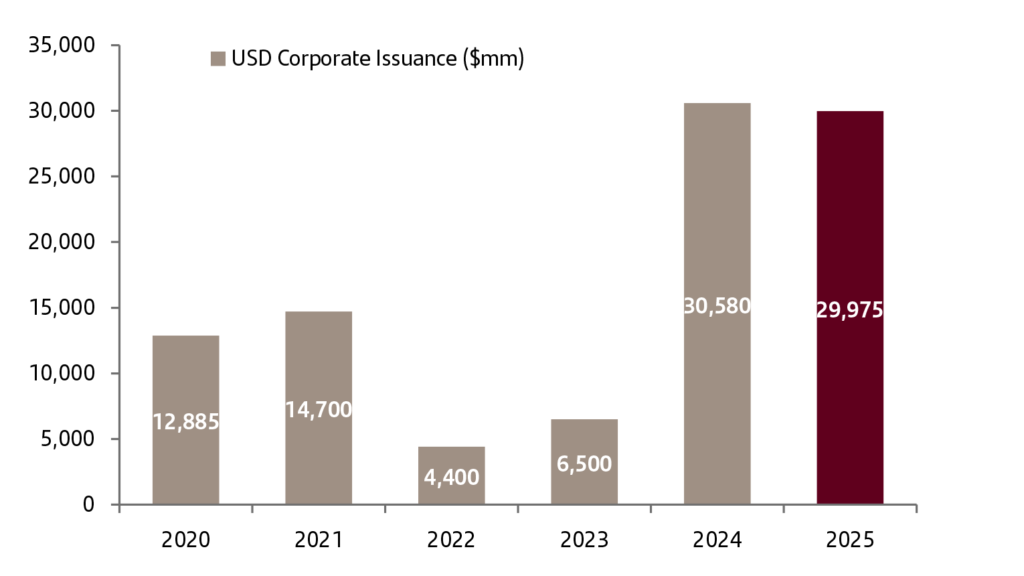 What was once a niche market with only a few issuers has become a more liquid and well-defined segment of the primary and secondary bond markets. Over the past two years, roughly 90 new issues have priced in the investment grade and ‘BB’ primary markets for non-bank hybrids, more than doubling the number of bonds trading in the overall universe. Volumes in 2025 are also on pace to surpass last year’s record (Exhibit 1).