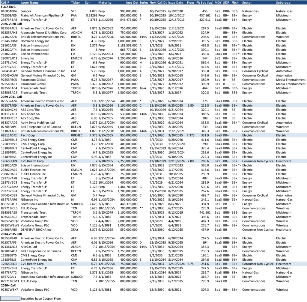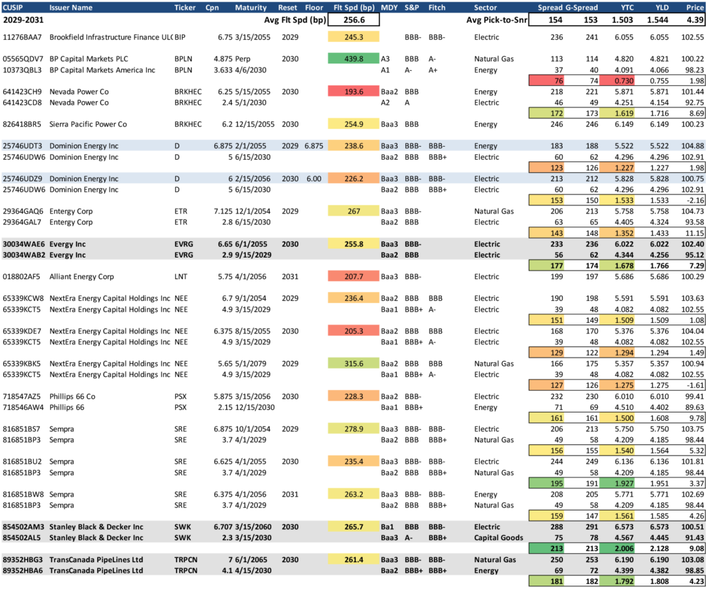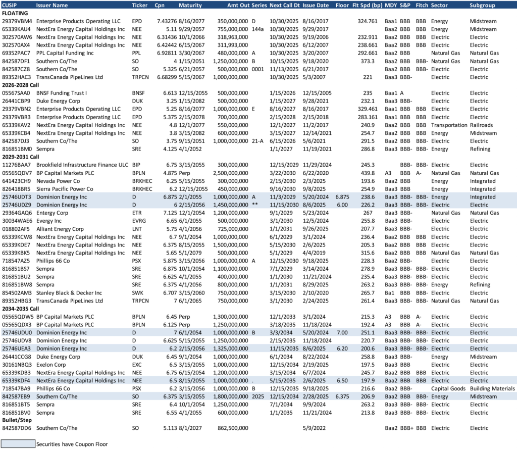As the sector has seen broader acceptance and engagement from corporate bond investors, and spreads have moved tighter overall, there increasingly appears to be less credit differentiation among issuers when valuing securities. Senior/sub premiums have more recently pierced the mental barrier of 100 bp. For example, the Dominion tap on the NC10 structure was roughly 90 bp to seniors. As a result, even more of the perceived value of the securities has become of a function of structure versus credit quality. Since late 2024, coupon floors protecting investors from extension risk by guaranteeing minimum reset rates have become an increasingly popular feature among issuers to draw more interest from perhaps less traditional buyers of these securities. Those floors are a major component of valuation, as extension risk and back-end floating spread have historically been a critical element of pricing securities in the secondary market.