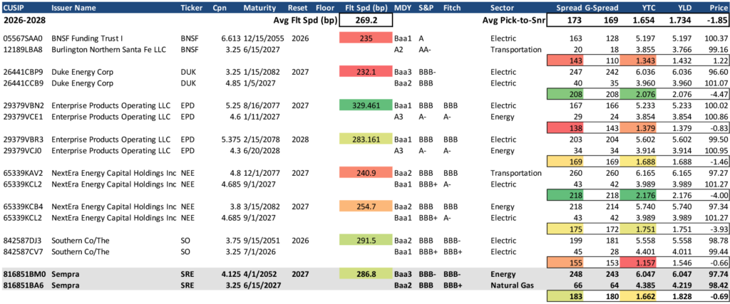 Exhibit 3 demonstrates investment grade issuers with aged-vintage outstanding hybrids with call dates between 2026 and 2028. The color scale in the middle indicates how the back-end floating rates compare to the other bonds in group, with the highest spread and most call protection depicted in green and the lowest in red. Similarly, on the right side of the study, there are another two color scales that depict the spread and yield-to-call picks available relative to senior bullet securities. The greater spread/yield picks are depicted in green with the lower in red. Not surprisingly, higher call protection generally translates to lower spread/yield picks relative to bullets. Ideal valuation appears to be where moderate call protection (light green to yellow) coincides with the most attractive spread and yield compensation. Among this group with approaching call dates, the SRE 2052s (callable 2027) with a 286.8 bp back-end spread are highlighted as offering attractive valuation relative the rest of the bonds presented.