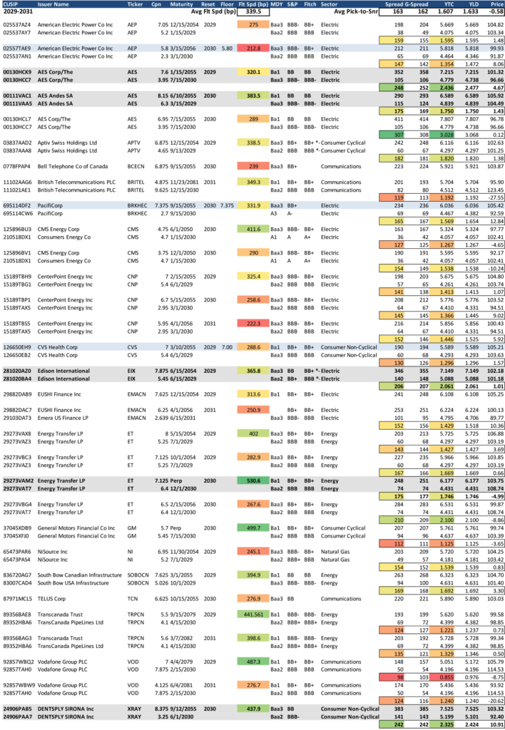 Exhibit 7 lists ‘BB’ hybrids with roughly 5-year calls (2029-2031) relative to similar 5-year bullet senior securities. This represents the largest segment of the of the entire non-bank hybrid universe. More recent issues with coupon floors on the back-end are highlighted in blue. Among this group, bonds highlighted that appear to offer good valuation versus seniors relative to call risk include: