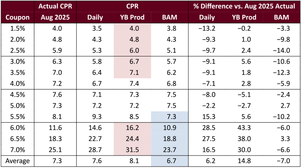Yield Book’s model is projecting faster speeds than the daily prepayments in most of the lower and higher coupons. However, that means Yield Book’s premiums speeds could be close to actual since the daily projections are likely to prove low. But Yield Book is likely to be too slow on 5.5%s. Cuspy coupons have been a persistent trouble area for this model, but this miss could also reflect some 5.5%s borrowers responding to the September rate rally. Yield Book’s speeds are likely to end up too fast in discounts.