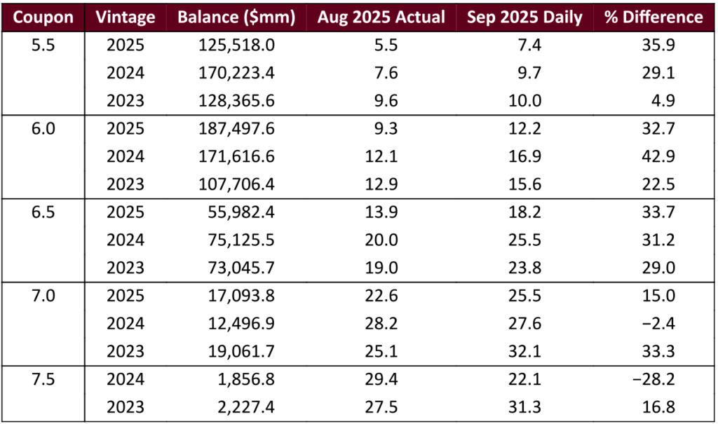 However, the 7%s and 7.5%s from the 2024 vintage look remarkably tame in September—both coupons are expected to slow, while the 2023s in each coupon should speed up measurably. This could reflect the weaker credit composition of the 2024 vintage in those coupons—it has a lower average credit score and higher average spread-at-origination. The 7.5%s 2024 also tend to have smaller balances.
