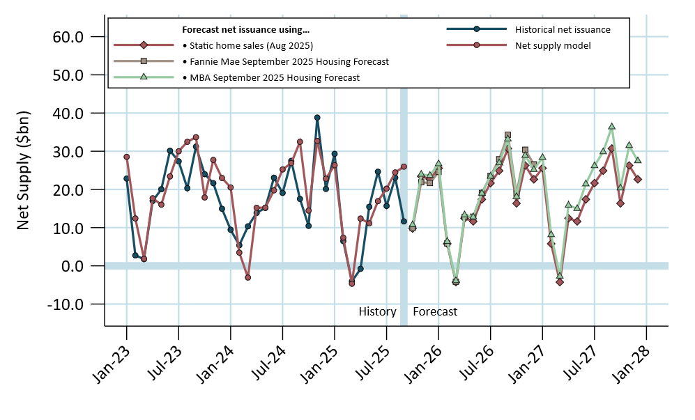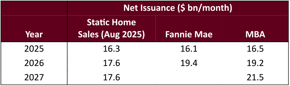 For 2025 net supply should end the year with a monthly average of about $16 billion to $16.5 billion (Exhibit 2). There is little sensitivity in 2025 to home sales forecasts since most of the year is settled. Supply should increase slightly, to $17.6 billion per month, if home sales remain at August levels. But home sales forecasts from Fannie Mae and the MBA suggest that issuance could increase to a range of $19 billion to $19.5 billion a month in 2026 and $21.5 billion a month in 2027.