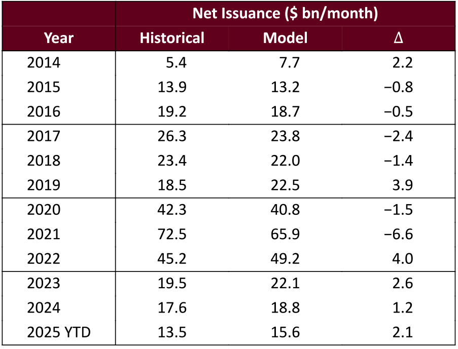 Over the last few years, the model has been close to actual, although biased slightly high (Exhibit 4). It was generally a little low before and during the pandemic, with the worst miss coming in 2021 when MBS issuance peaked.