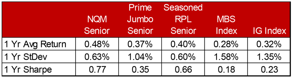 When analyzing returns on a volatility-adjusted basis, the advantage offered by private label RMBS exposures is more pronounced. Non-QM seniors have delivered a 1-year Sharpe ratio of 0.77, 59 bp better than the Sharpe ratio posted by the MBS index and 54 bp better than that of that of the investment grade corporate index (Exhibit 2).