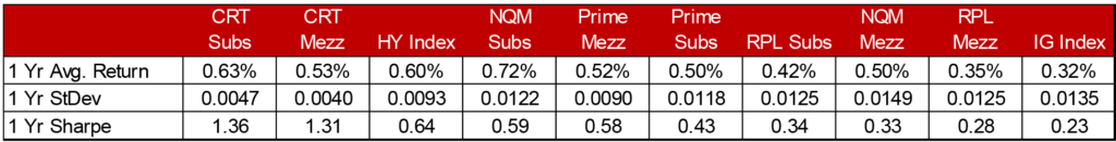 An analysis of various mortgage credit exposures shows that over the past year, non-QM seniors and mezzanine and subordinate classes of Fannie Mae and Freddie Mac credit risk transfers have delivered the highest risk-adjusted returns beating those posted by bonds across the capital structure in both prime jumbo and seasoned RPLs. The 1-year Sharpe ratio posted by non-QM seniors was substantially better than those of both the aggregate MBS and investment grade corporate bond indices. Mezzanine classes of CRT significantly outperformed the investment grade index as well. While subordinate classes of GSE CRT bonds fared markedly better than the high yield index.