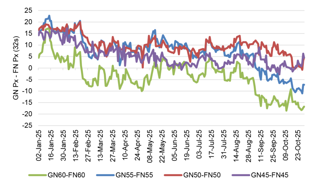 At the start of the year Ginnie Mae TBA traded roughly 5/32s above UMBS in 6.0%s and around 15/32s higher in 4.5%s, 5.0%s and 5.5%s (Exhibit 1). Things have changed as mortgage rates have dropped this year. At the recent low point on mortgage rates in October, the 4.5%s and 5.0% price spreads were around zero, the 5.5%s were -10/32s, and the 6.0%s were approaching -20/32s.