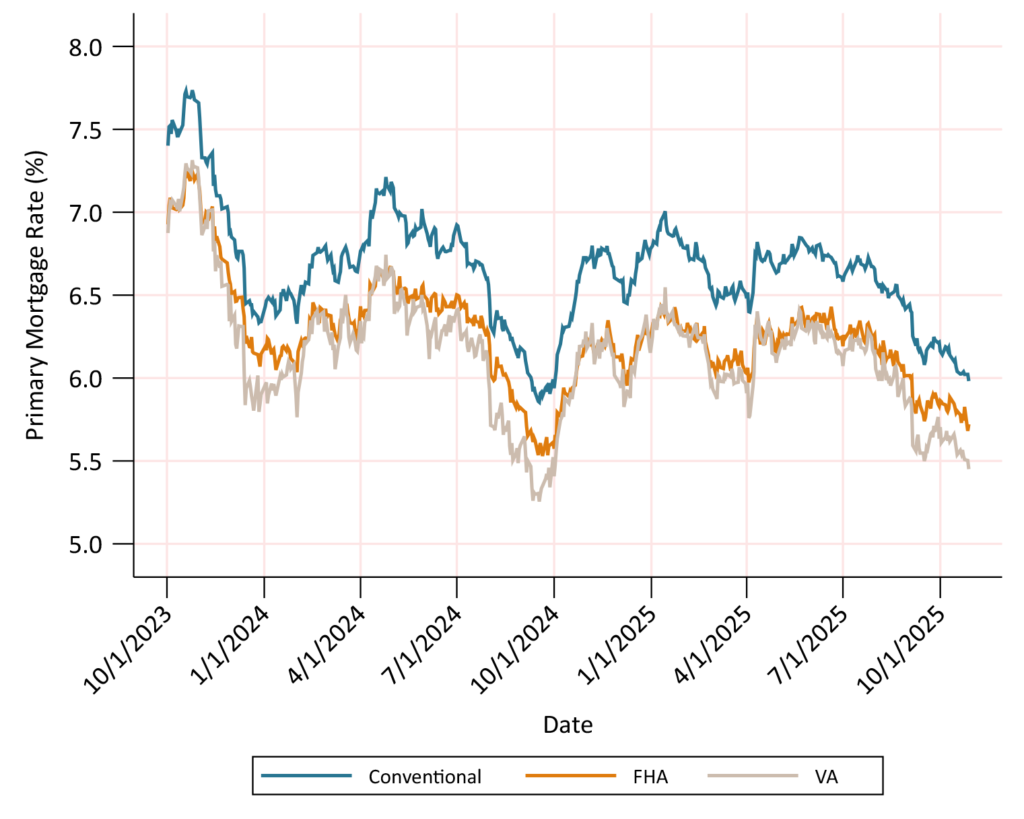 Part of the drop in price spreads since the start of August is due to lower mortgage rates (Exhibit 2). Mortgage rates for VA loans are generally lower than conventional rates, and the VA mortgage rate has fallen more than conventional and FHA rates. This means that the Ginnie Mae TBA is further in-the-money than the equivalent coupon UMBS TBA, so Ginnie Mae speeds should start to increase before conventional speeds.