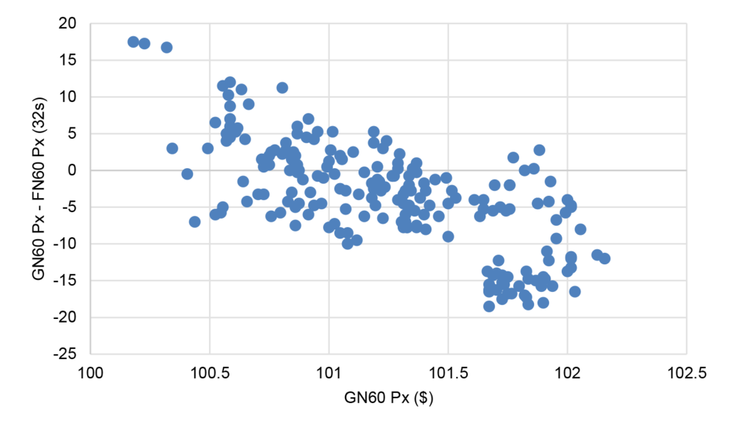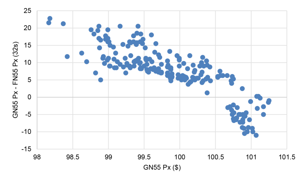 The price spread for the 5.5% coupon, however, was lower than the 6.0% swap at the same price of the Ginnie Mae TBA (Exhibit 4). For example, the price spread never exceeded roughly 13/32s when prices were above par, below the maximum price spread for the 6.0% coupon. And the spread was negative for prices above $100.75.