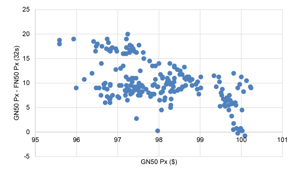 The pattern is similar for the 5.0% coupon (Exhibit 5). It has only traded near par, not far above par, but around par the price spread was rarely above 10/32s and often close to zero. This coupon only approached par in September and October, so the lower spread at par likely reflects the lower convexity of new Ginnie Mae multiple issuer pools.