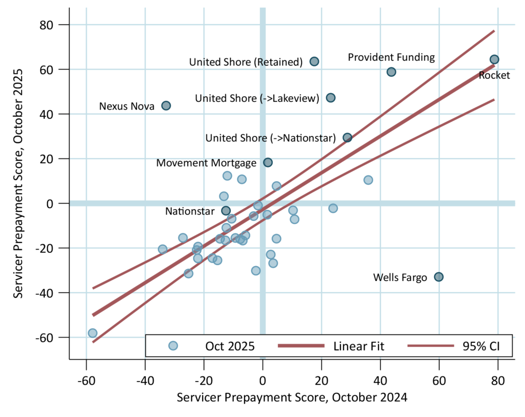 It is also helpful to compare to October 2024, the last large refinance event (Exhibit 2). The servicers that had strong prepayments compared to September were also strong compared to last October. The adjusted R2 is 0.66, not quite as strong as the prior comparison.