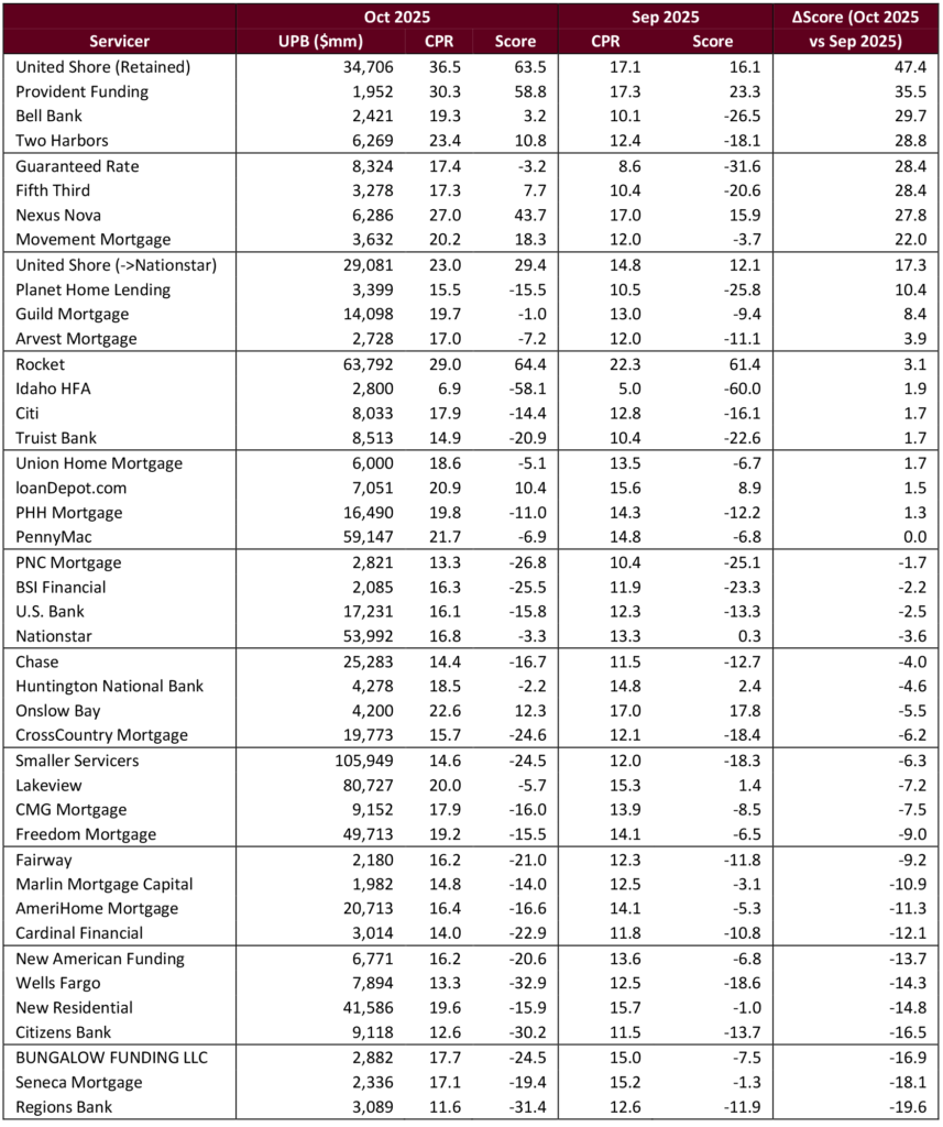 It looks like a handful of the largest servicers, most notably United Shore, may have played an outsized role in the fast prepayment speeds in October 2025. However, measures of refinancing activity published by the MBA, Fannie Mae and Freddie Mac suggest that refinance activity is already waning, despite mortgage rates that, since mid-October, have been near or below the September low. There is a chance these servicer scores could revert to pre-October levels in the coming months. But investors should be aware that certain servicers’ loans may repeat this strong prepayment response the next time mortgage rates drop.