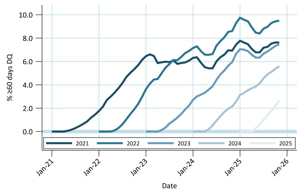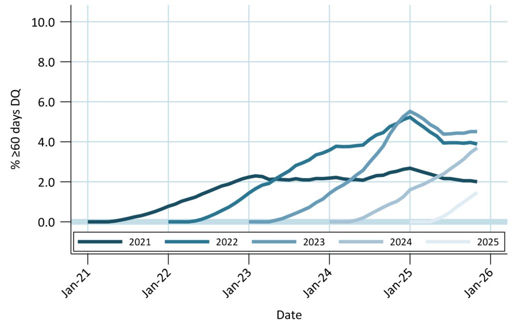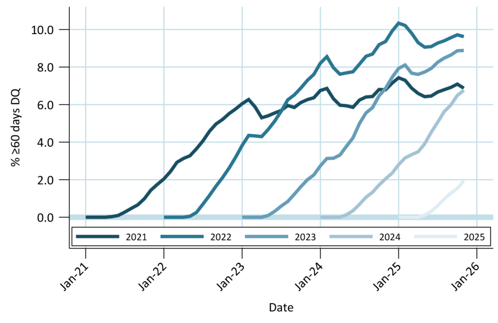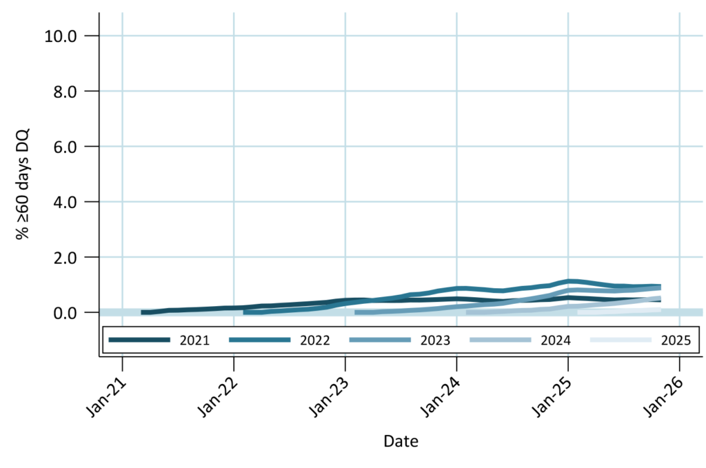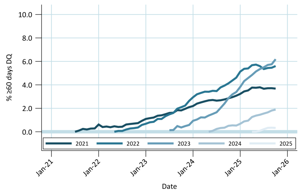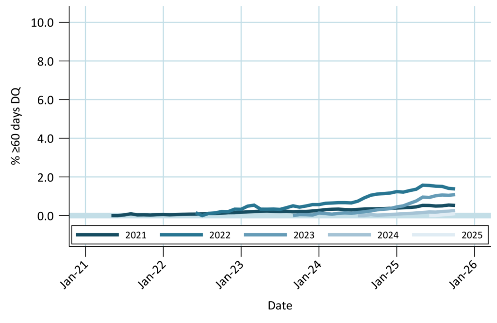 VA borrowers show some stress in post-Covid vintages, but less than FHA. Buyouts prevented DQs from rebounding from the springtime low. 2025 vintage DQs growing somewhat faster than older vintages did. Seasoned vintage DQs held steady month-over-month.