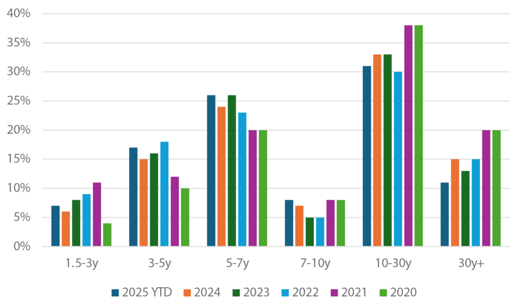 The market also could see significantly higher net growth in the coming year, particularly with the ongoing technology and AI buildout driving some of the recent jumbo debt launches that are pushing volume higher. Furthermore, large capital projects look likely to surface in response to significant tax incentives in the One Big Beautiful Bill Act. Also notable until more recently had been the lack of 30-year supply in the market until some of these late-stage tech deals (ORCL, META, GOOGL) hit the tape. As of summer’s end, debt with 30-year or longer maturities made up just 11% of new supply, compared with a 5-year average of about 17% (Exhibit 1). This added tremendous technical pressure in the long-end of the curve throughout much of 2025, a trend that may not persist in 2026 with more jumbo launches from the TMT segment.