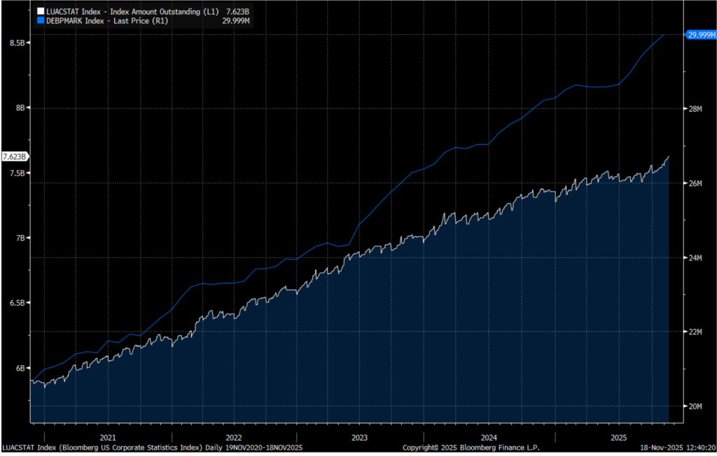Investment grade corporate new issue has been a big story throughout 2025. Current gross volume stands at just under $1.6 trillion for the year, on pace for the second highest issuance total in history. Only the $1.9 trillion issued in 2020 tops this year. Meanwhile, net supply is on track to finish the year between $300 billion and $475 billion. Hefty gross levels of debt issuance in the current year were at least in part due to the sizable maturity wall that resulted from the record gross levels in 2020. Early guidance is calling for another banner year in 2026. Some estimates call for 10% to 15% growth in gross volume, with some looking for as much as $1.8 trillion in the coming year. Net supply is expected to increase to as much as $600 billion to $800 billion.