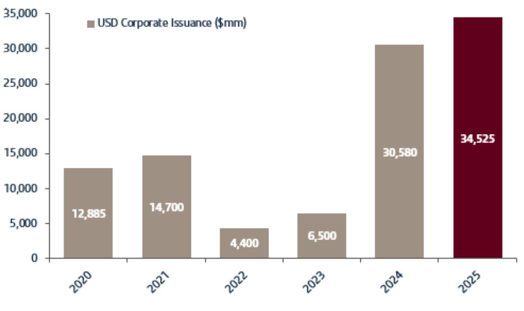 Another structure trend in 2025 within the IG landscape has been the increased use of pre-capitalized securities or P-CAPs . While traditionally a structure that has been used almost exclusively in the insurance sector, Mexico’s $12 billion bailout of Pemex in 2025 utilized the issuance of P-CAPs, demonstrating the potential for much broader application across a variety of potential different industries – something that could materialize more in 2026. Additionally, new insurance companies employed the structure for their capitalization needs throughout the year, including MET and LNC.