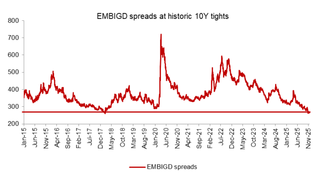 Exhibit 1A: Emerging market spreads at the tightest levels in 10 years