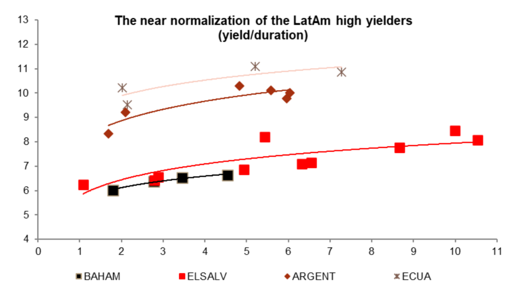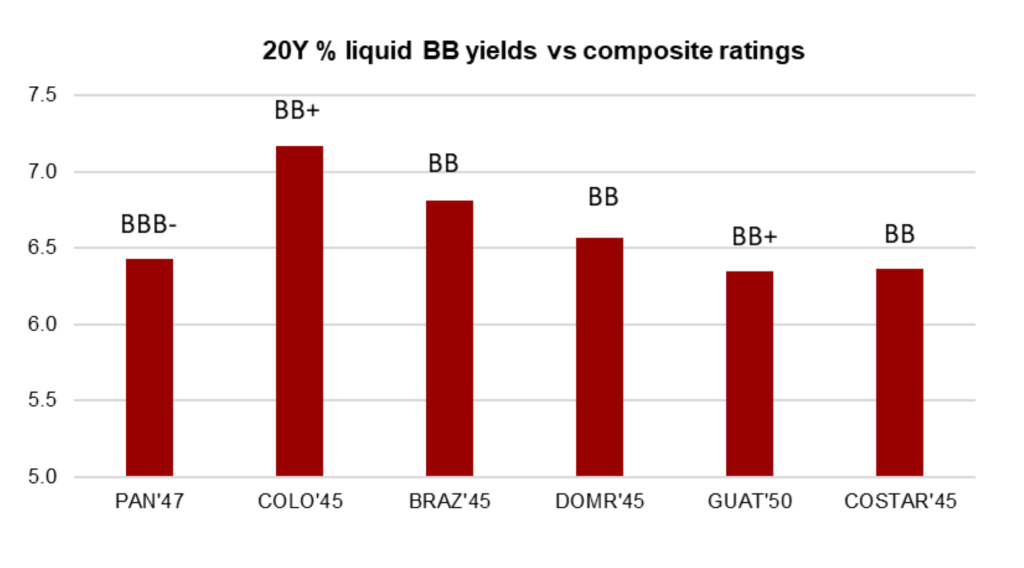 #3: Bahamas as the misaligned BB credit. The Bahamas made the full transition from ‘B’ to ‘BB’ this year after moving from a fiscal deficit of 12% of GDP at the peak of pandemic to 0.5% of GDP in FY2024-2025. This fiscal year it should become the only country in the region to adopt tax reform and to post a nominal fiscal surplus. The track record of fiscal discipline and potential tax revenues approaching 25% of GDP could allow for faster reduction in debt ratios below 70% of GDP and potential for further upgrades. The Bahamas also is unique for offering the highest yield among BB credits, even wider than Colombia. The illiquidity of the country’s debt lowers correlation to global financial markets while the higher credit ratings and stronger fiscal liquidity and solvency metrics should also lower the vulnerability to external shocks. The curve should benefit from bull steepening with most value in the intermediate tenors.