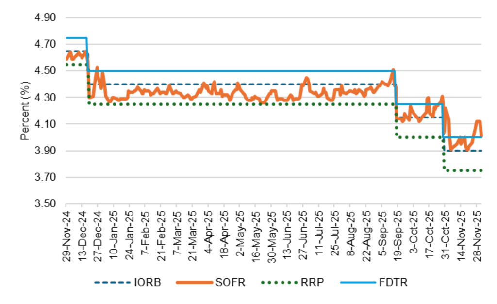 • Setting on 3-month term SOFR traded Friday at 374 bp, reflecting market expectations for a Fed rate cut on December 10
