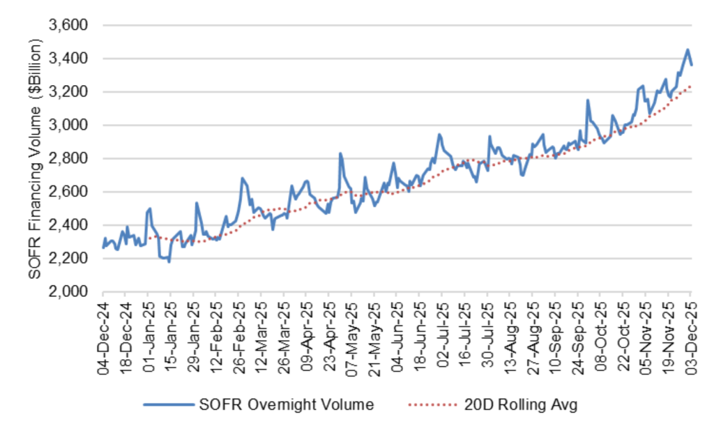 The high price for repo partly reflects a surge in demand. Demand to finance Treasury positions has gone up steadily over the last year, but especially since early October. SOFR financing balances jumped from $3.07 trillion on October 1 to $3.36 trillion on December 1, up 9.3% (Exhibit 2). A rolling 30-day average of SOFR balances, good for filtering monthly noise out of the numbers, shows the same thing. Since the start of October, that average is up 11.9%. Fed data shows primary dealers holding bigger Treasury positions over that period, and hedge funds anecdotally have added to positions as well. Both need financing.