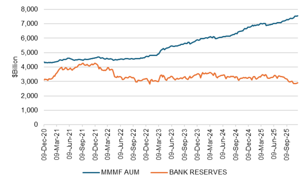 Exhibit 3: Bank reserves fall, money fund AUM rises