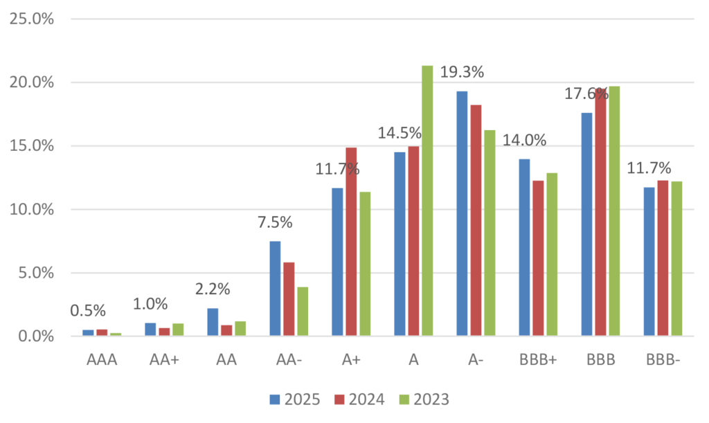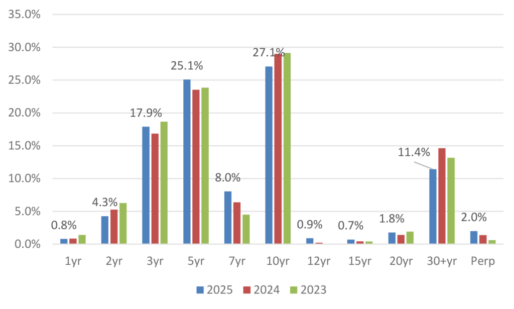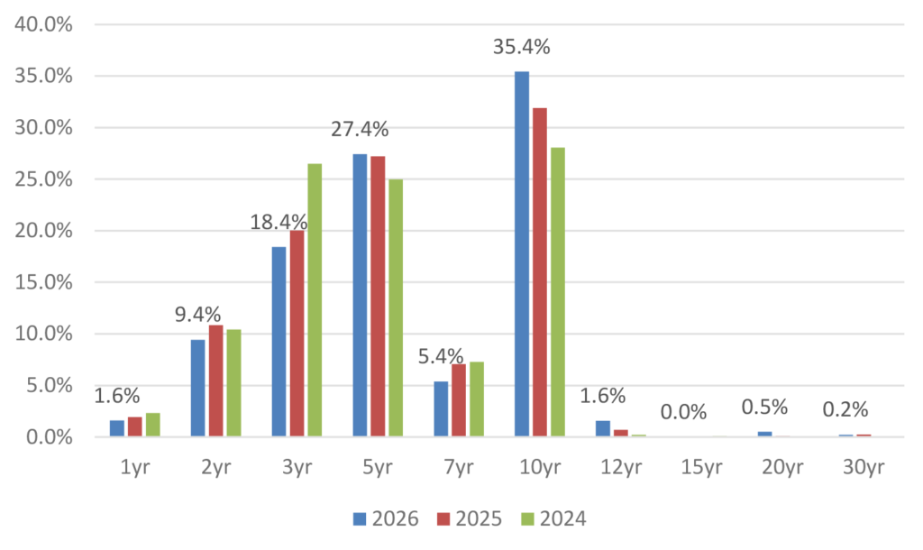 Much attention was made about the notable maturity wall in 2025 as a result of all the 5-year debt issued during the 2020 boom of new issue volume, and the prospect for significant issuance leading into the year. Still, with over $800 billion in approaching debt maturities in 2026, there is a considerably large maturity burden approaching that has projections for gross issuance inflated for the coming year as well. A breakdown of the original tenors of that debt coming due over the next twelve months versus the previous two years demonstrates a considerably large portion of 10-year debt reaching maturity (Exhibit 4). Comparatively, the percentage of 3-year debt reaching maturity is down significantly over the prior two years.