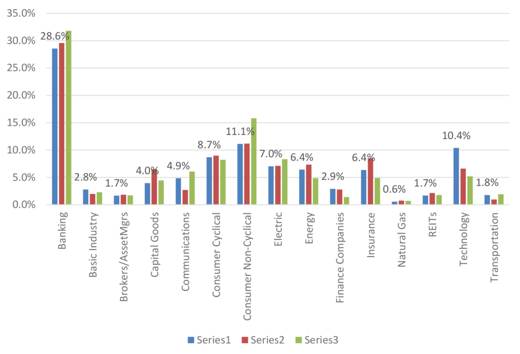 The last breakdown of the upcoming maturity schedule for 2026 demonstrates broad sectors on a percentage basis (exhibit 6). Not surprisingly, tech maturities are on the rise commensurate with recent new issue growth, and a higher share of the overall index. Beyond a slight stepdown in consumer for next year and slight rise in insurance, the balance of upcoming debt maturities remains remarkably similar for 2026 versus the two prior years.