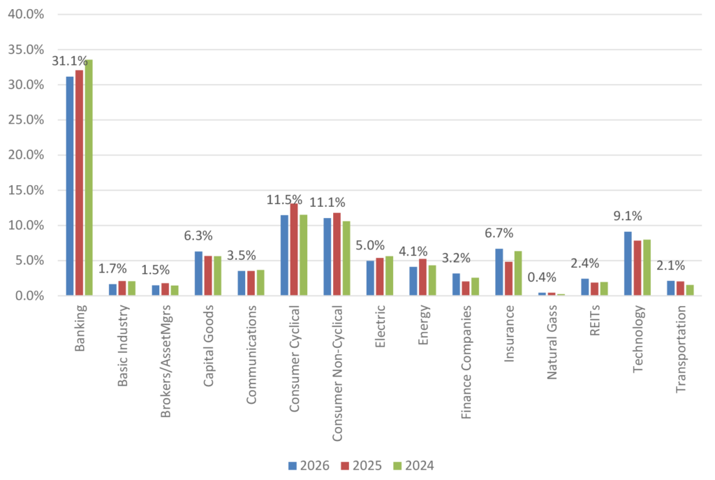 New issue volume in the tech sector reached 10.4% in 2025 (Exhibit 3). That compares with a year-end index weighting of about 9.5% and is double the relative amount issued just two years ago. Comparatively, percentage issuance in the utilities, banking and consumer non-cyclicals have all been trending downward over the past three years. There was also a considerable year-over-year drop in insurance issuance by percentage.