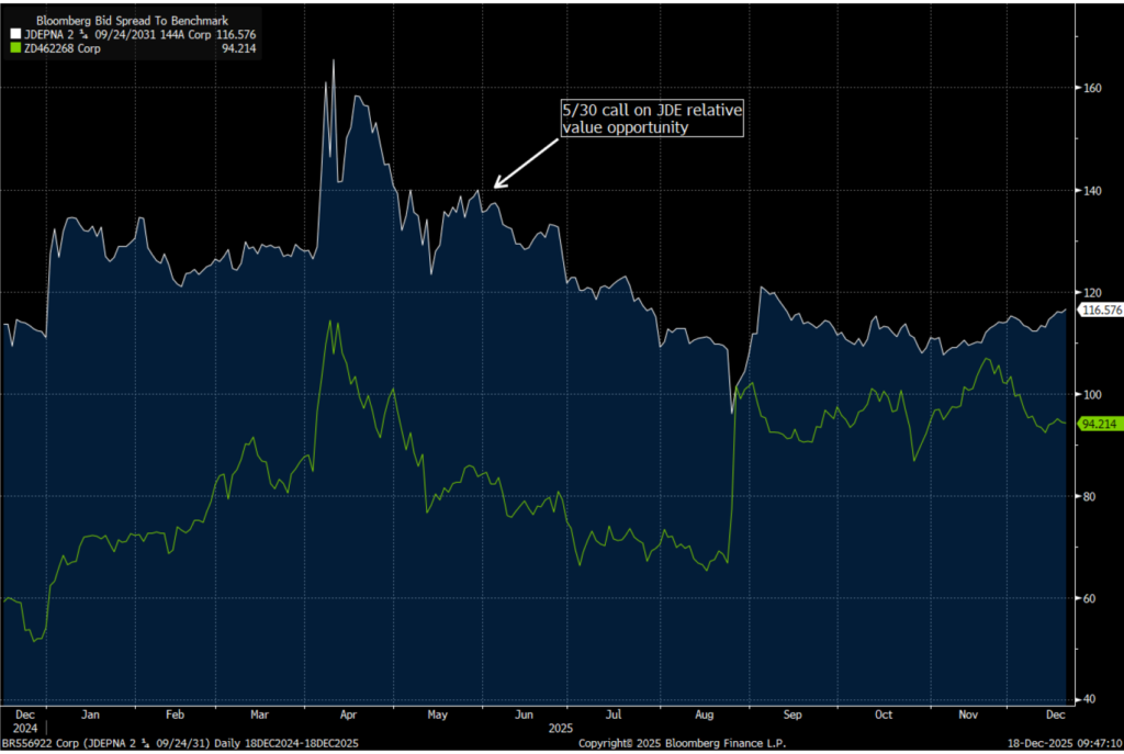 The call on JDE Peet (JDEPNA: Baa3/BBB-/BBB*-) in May worked as a function of timing with spreads still wide following April tariff concerns. But the announcement of the debt-funded acquisition by Keurig Dr Pepper (KDP: Baa1*-/BBB*-/BBB-) and spin-off plans in August served as a major credit event that will influence valuation going forward that were not part of that stand-alone recommendation. Going forward there does appear to be some attractive compression available in JDEPNA relative to KDP paper (exhibit 3), but the fundamental risks of the eventual combined entities and spin-off plans are worrisome.