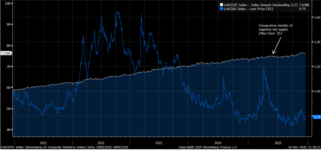 During two of the slower issuance months of 2025 (May-June), the investment grade index saw two consecutive months of net negative supply to par value. It appeared then that may be keeping spreads artificially tight. And while temporarily true as spreads reached their local tights in September at a spread of 72 bp over the Treasury curve, new issue rapidly increased setting three consecutive months of record gross volume in Sept – Nov contributing to wider spreads over that stretch (Exhibit 4) before settling lower in December.