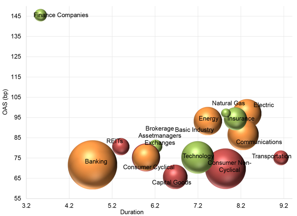Color = recommendation: Green – stronger relative value, Red – weaker relative value, Yellow – neutral relative value. Size = Market Value within the IG Index