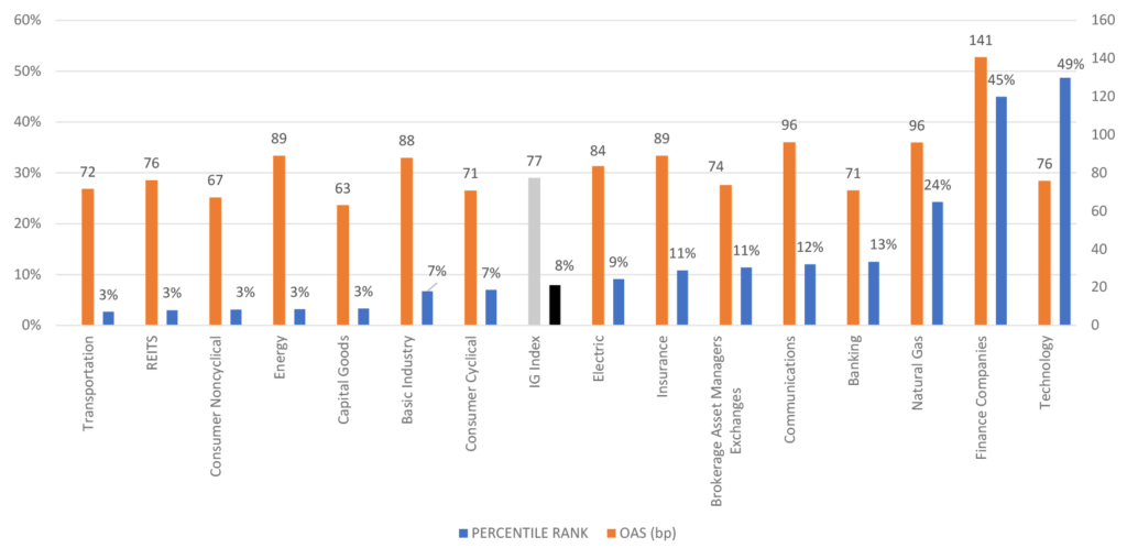 Note: the blue bars represent percentile rank (LHS), the orange bars represent OAS (RHS).