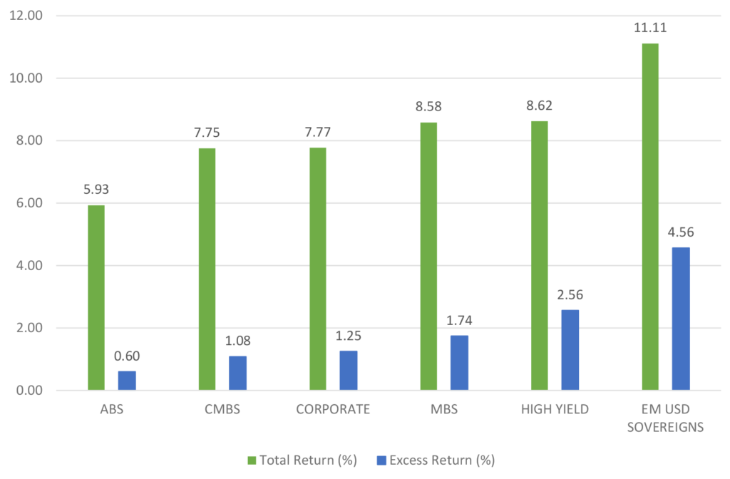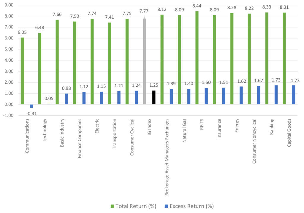Within the index, the sectors that outperformed on an excess return basis in 2025 were largely banks, capital goods, non-cyclicals and energy (Exhibit 2). Not surprisingly, communications (dragged down by idiosyncratic credit situations) and technology (impacted by tremendous issuance in the later months) were the bottom performers for the year.