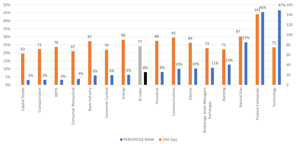 Exhibit 4: Investment grade sectors – current spread percentile ranks (vs five-year trading range)