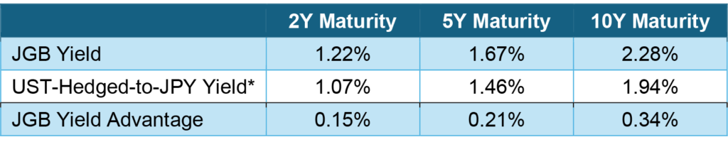 JGBs now top the yield on comparable US Treasury debt after hedging out currency risk. Japan’s 2-year note beats the hedged yield of the same US maturity by 15 bp, the 5-year note by 21 bp and the 10-year note by 34 bp (Exhibit 1). Yield alone is not the only draw of Treasury debt—liquidity, safety and other things also show up on the list—but it is a big one.