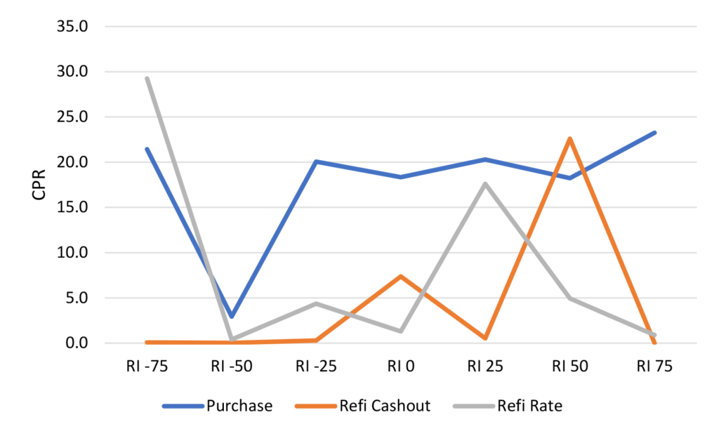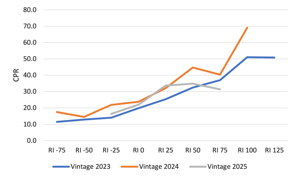 Focusing primarily on recent vintage cohorts, specifically the 2023 through 2025 vintages shows that fast speeds are due to somewhat of a barbelled effect. The 2023 and 2024 vintages are backed by loans that carry significant refinancing incentive, upwards of 100 bp. While the 2025 vintage is showing relatively elevated at-the-money speeds and is paying fast with fairly minimal amounts of incentive. 2024 vintage loans with a point of refinancing incentive are prepaying at nearly 70 CPR. The 2023 vintage appears to be showing some modest burnout on deeper in-the-money loans, but speeds are still quite fast, as 2023 vintage loans with 100 or 125 bp of incentive are prepaying at 50 CPR. At the opposite end of the WALA ramp, 2025 vintage loans with no incentive are prepaying 21 CPR, while loans with just 25 bp of incentive prepay at nearly 34 CPR (Exhibit 2).