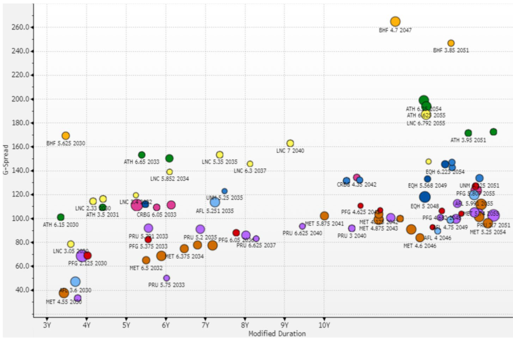 While exposure to private credit is highly material, it is important to recognize that the investment grade public life insurance operators are extraordinarily well capitalized, often at the ‘AA’ level. Furthermore, their investment holdings are diversified to mitigate major risk concentrations by comparison to smaller, private operators within the industry. However, the prospect for weaker performance across investment portfolios increasingly appears a legitimate potential overhang for near-to-intermediate term profitability, which over time can weigh on credit metrics. Therefore, there does not appear to be a very near-term catalyst for spreads to tighten back as these concerns are more likely to persist than unwind.