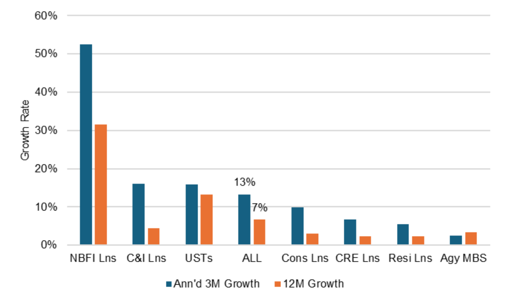 Lending to non-bank financial institutions has led not just the most recent bank asset growth but growth for the last year and beyond. Lending to NBFI, which includes a wide set of borrowers from insurers to mortgage originators to business development companies and private credit funds, has run up at an annualized rate of 53% in the last three months (Exhibit 1). It has increased by 32% in the last year. The pace has outstripped every other major category of bank assets.