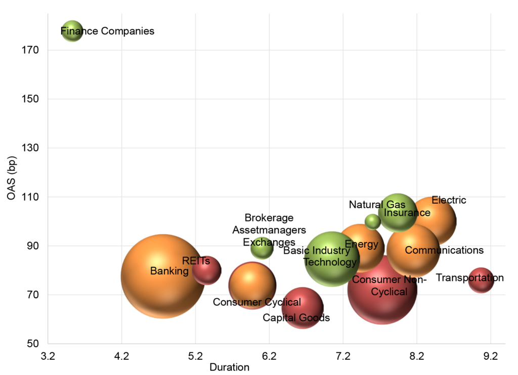 Color = recommendation: Green – stronger relative value, Red – weaker relative value, Yellow – neutral relative value. Size = Market Value within the IG Index
