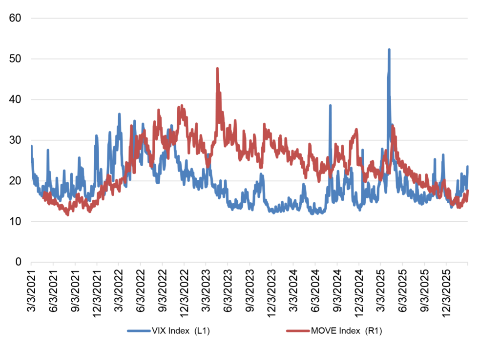 Source: Bloomberg LP, Chicago Board Options Exchange Volatility Index, ICE BofA MOVE Index