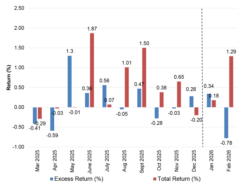 Investment grade corporates last month delivered their worst monthly excess return since September 2022. Private credit anxieties hit non-bank financial sectors including insurance, brokers and BDCs. Meanwhile, the threat of AI overbuild continues to weigh on the technology sector. Still, mutual fund flows into the sector continue to be vastly positive while new issue activity is outpacing the record levels recorded in 2024 and 2025. Credit trends in investment grade also continue to be overwhelming positive through rating agency actions.