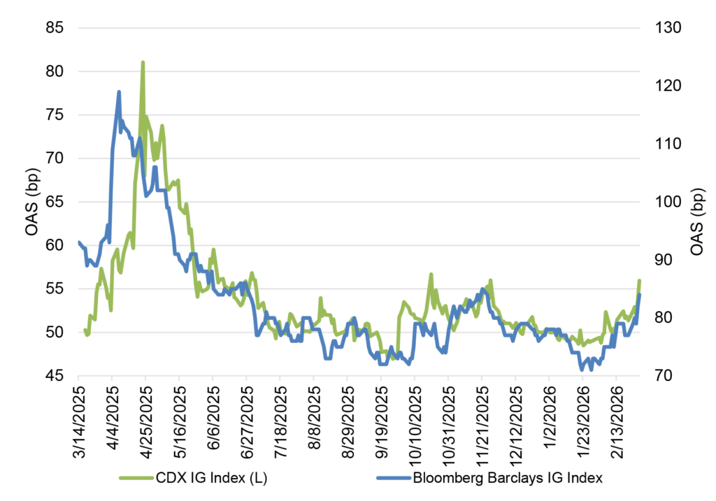 Exhibit 7. Index and CDX spreads back to the wides of late Nov 2025