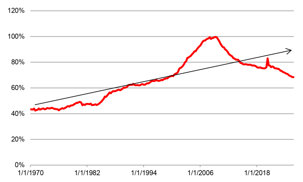 A similar way to assess household debt is to compare it to disposable income.  This ratio inched up slightly in the second half of last year but, aside from some distorted readings during the pandemic, is at its lowest level since 1998 (Exhibit 2).