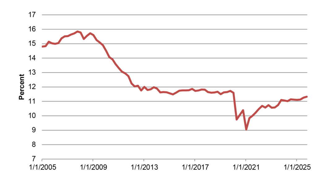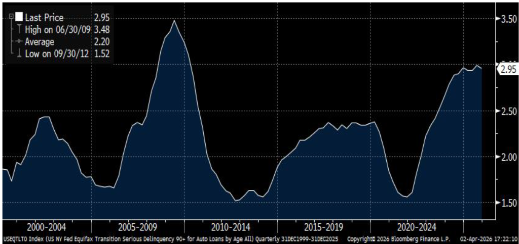 Auto loans, at least 90+-day delinquencies as compiled by the New York Fed and Equifax, tell a different story (Exhibit 9).  Here, the story is more troubling, as the delinquency rate is well above 2018-2019 levels.  If there is a silver lining, it is that the delinquency rate has leveled off since the end of 2024, though at the highest readings since the Global Financial Crisis.