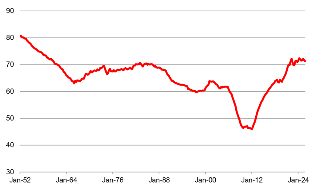 Real household liquid assets moved most of the way back to the trend line by the middle of 2023.  After that, real liquid assets resumed growth, suggesting that households viewed their cash positions as back to “normal.” Presumably, if they were sitting on elevated liquidity that they intended to spend, the series would have continued to decline.