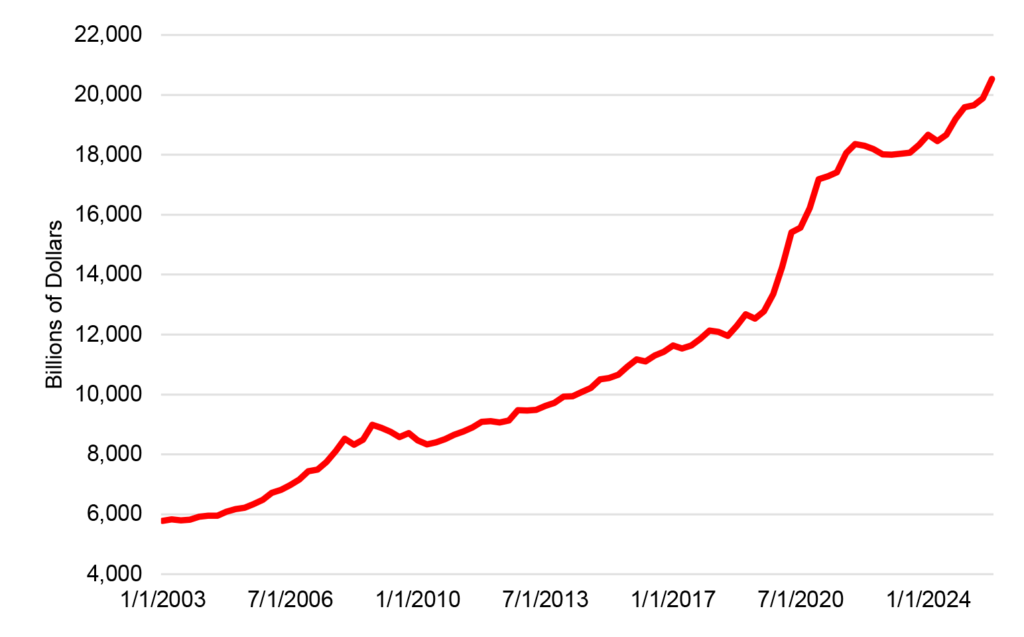 Household liquid assets spiked during the pandemic, reflecting in large part the unprecedented waves of federal government largesse. Most economists presumed that consumers would spend down those balances quickly once the economy fully reopened.  However, liquid assets have remained elevated by historical standards (Exhibit 5).  Indeed, this aggregate reaccelerated in 2025, posting the largest increase ever in dollar terms (over $1.3 trillion) aside from 2020 and 2021, roughly a 7% advance.