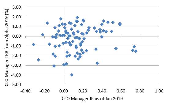 Note: Information ratio as of 12/31/18 and total return from alpha from January through December 2019. Both measures available for 99 CLO managers. Source: Amherst Pierpont Securities