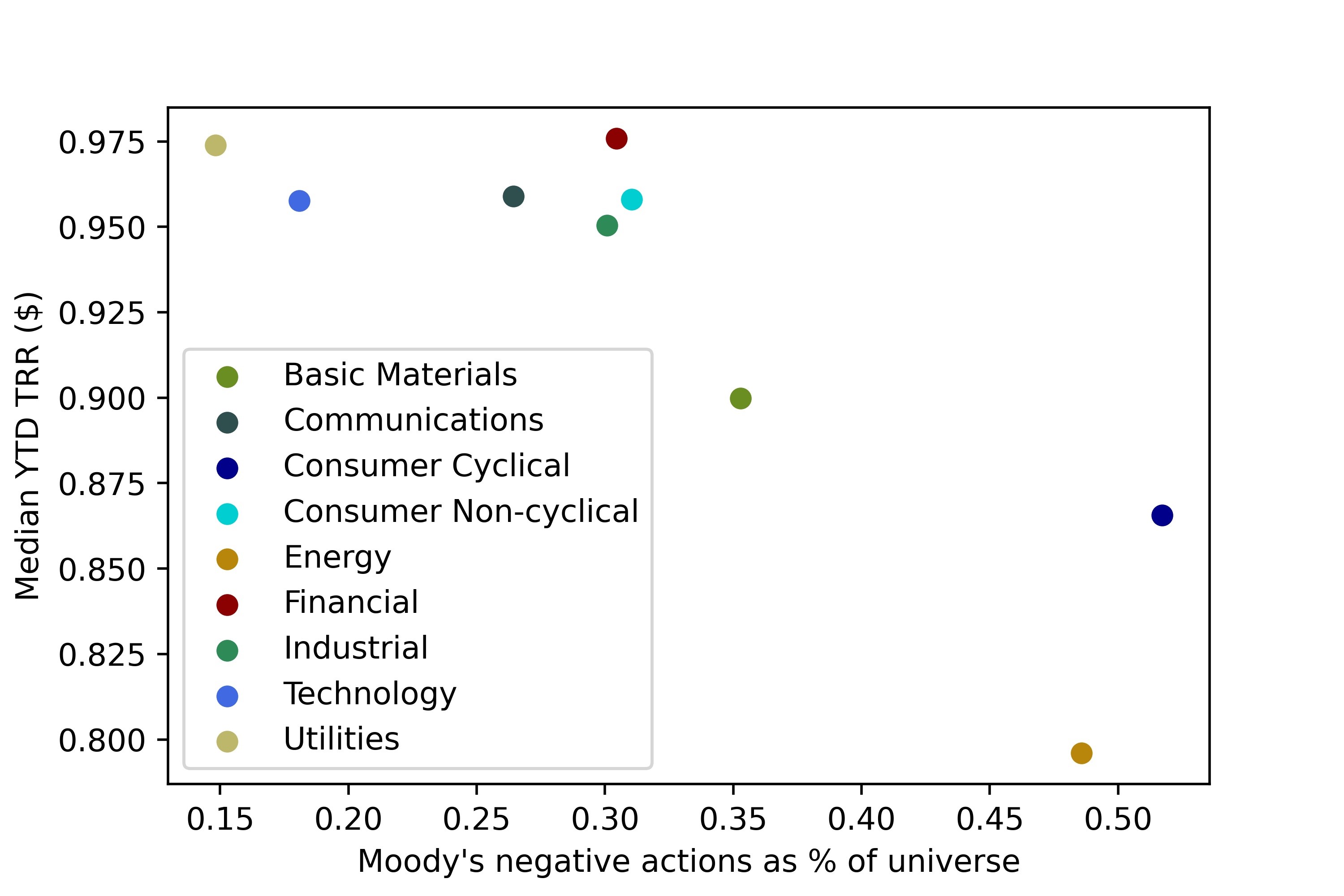 Technology provides year-to-date returns of between $0.94 and $0.97 with median of $0.96, and Utilities gives a similar year-to-date return of $0.97. Moody’s has taken lighter negative actions in these sectors, respectively on 18% and 15% of loans.