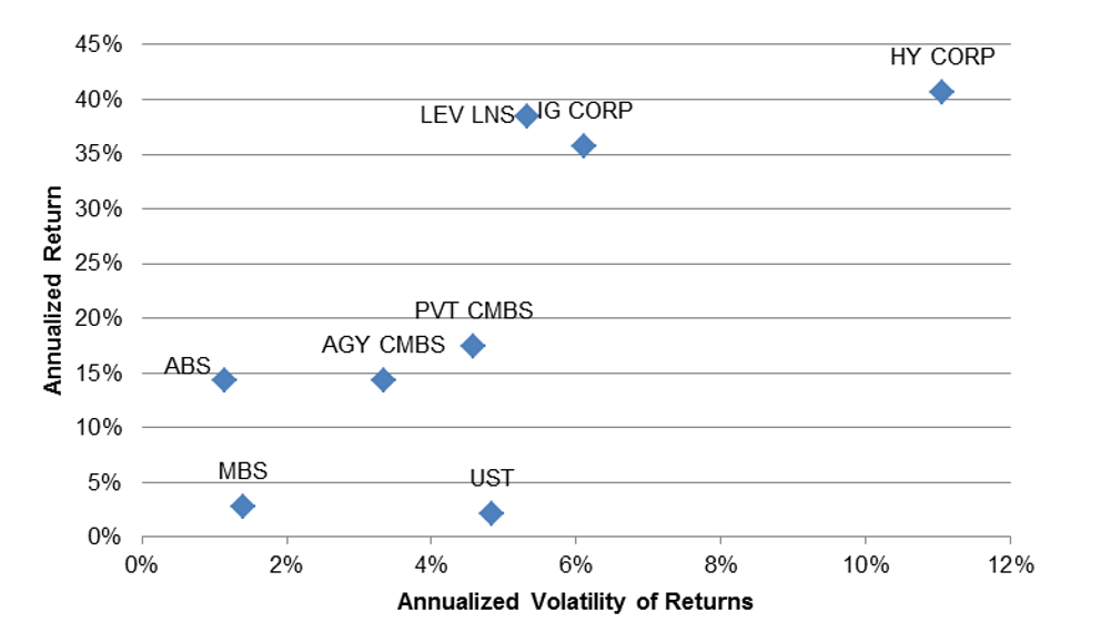 The last quarter saw both Fed and fiscal policy drive asset performance, with the Fed launching a major round of market support on March 23 followed four days later by passage of the CARES Act. Annualized returns on high yield (40.6%) and investment grade (35.7%) corporate credit along with leveraged loans (38.4%) led the market. Structured credit followed with good annualized returns in private CMBS (17.4%) and ABS (14.4%). Agency CMBS (14.3%) finished next, with the Fed’s other QE targets of agency MBS (2.7%) and Treasury debt (2.1%) trailing (Exhibit 1).